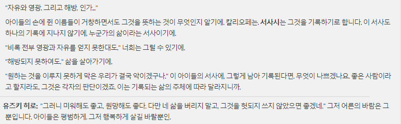 그리고 이건 유즈키가 과거의 자신에게 하고 싶은 말일지도 모른다는 생각을 했습니다. 영광과 자유를 얻지 못하고 해방되지 못한다고 해도 삶을 살아가고 그렇게 살아가길 바라니까. 마음만 먹으면 그 과거에서 벗어날 수 있으니까. 아마 이 시점부터 유즈키는 자신의 과거에서 벗어났을거라고 봅니다. 아이들을 구하고, 아이들과 소통하는 과정에서 자신의 트라우마도 지워냈을 테죠. 어른도 성장하게 만드는 아이들의 힘이라고 생각하기도 하고...