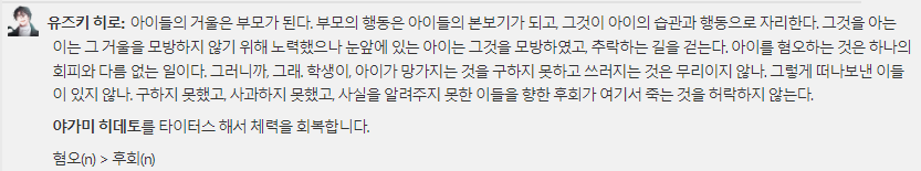 사실 클막에 들어갔을 때부터 리저를 못하는 시점이었어서 (대단하다 등침! 찢었다 등침!) 히데토를 로이스로 취득하고 타이터스 했을 때, 후회가 된 건 그 때문이었을 거라고 생각해요. 아마 그건 설명하는 것 보다는 첨부하는 게 좋을 거 같아서 그때의 생각을 첨부합니다.