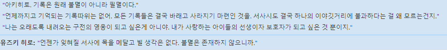 구전의 영웅이 아닌 보호자가 되고싶을 뿐인 유즈키의 생각은 그렇게 정리되었다고 봅니다. 세 개의 세션 내내 고민하던 것을 마지막에 와서야 결정했다고 생각했습니다. 아주 오래걸린 이야기였죠. 아이들에게 올바른 길을 인도해주고, 외부의 취약점에서 보호해주며, 그것을 이겨낼 수 있는 방법을 알려주며, 자신의 길을 나아가길 바라는 선생이자 보호자인 자신의 길을... 아이고 오래 걸렸다.